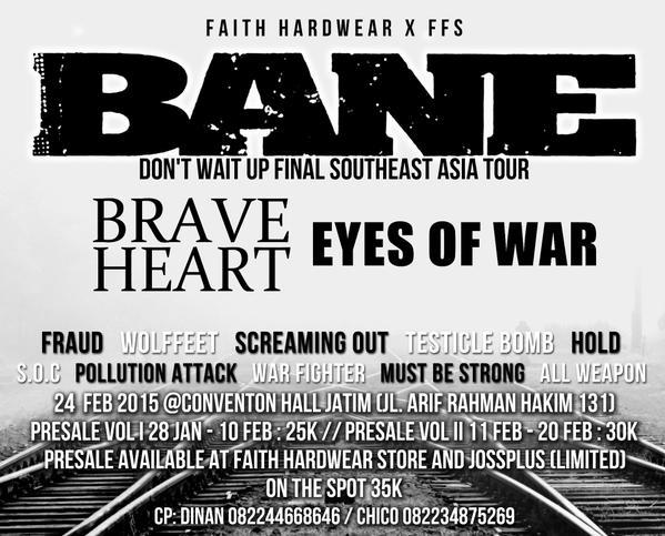 Agenda lagi buat para hardcore kids Surabaya dan sekitarnya yang mau lihat band legiun hardcore asal Boston wajib datang dalam gigs seru ini, very welcome to BANE especially to Surabaya. 24 februari 2015 di Convention Hall Jatim (Jl. Arif Rahman Hakim No 131, dekat dari kampus ITATS). dalam rangkaian tour BANE di indo ini ada dua band lokal yang turut serta join yakni Brave Heart (jakarta) dan Eyes of War (bandung). tidak terlupakan juga band-band hardcore dan punk asli Surabaya jadi opening, mereka adalah Fraud, Wolf Feet, Screaming Out, Testicle Bomb, Hold, Strenght of Change, Pollution Attack, War Fighter, Must Be Strong dan All Weapon. budget yang kalian keluarkan hanya 25ribu saja untuk tiket pre-sale ataupun 35ribu tiket on the spot, gak mahal lah brow untuk gigs se-syaik ini. jangan pikir panjang untuk join seru-seruan bareng bertegur sapa nan ber-moshpit ria dengan kawan kalian, be there kids!.