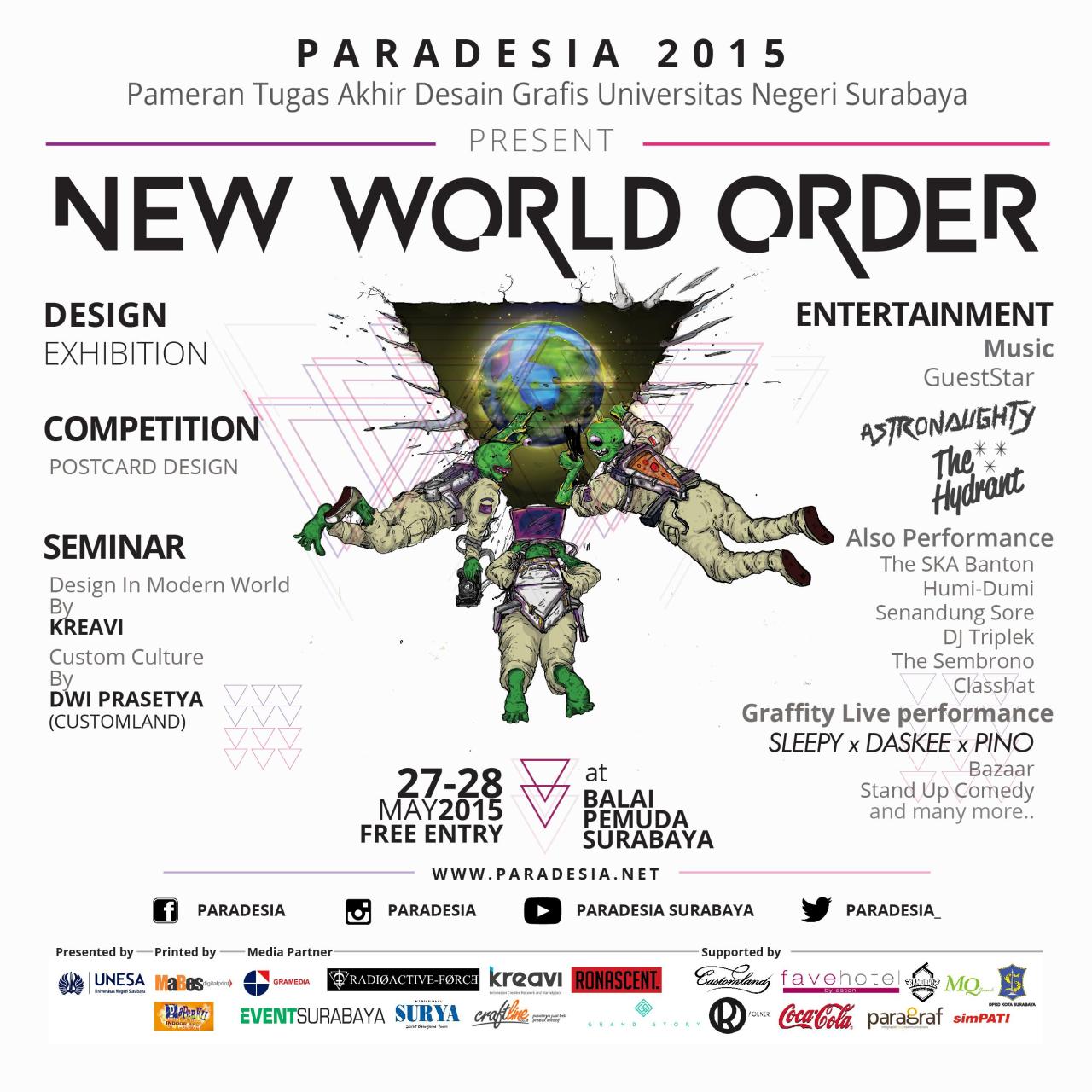Yups sajian tersebut akan direalisasikan dari teman-teman Design Grafis Universitas Negeri Surabaya (UNESA) pada tanggal 27-28 Mei 2015 di Balai Pemuda Surabaya. event yang bertitle PARADESIA 2015 dan bertemakan NEW WORLD ORDER ini akan mengajak kalian jauh lebih fresh, fun, rileks berskala maksimal. ada Design Exhibition, Competition Postcard Design, Seminar, Graffity Live Performance, Stand Up Comedy, Bazaar dan tidak terlupakan Entertainment dari band-band lokal seperti The Ska Banton, Humi Dumi, Senandung Sore, DJ Triplek, The Sembrono, Classhat kemudian kedatangan guest dari Jakarta yakni DJ Akira sebagai Astronaughty, ada juga jagoan rockabily asal Bali yakni The Hydrant. lengkapnya lagi event ini diadakan secara FREE HTM brow, nah lhooo mau ragu apalagi buat datang. akan ada banyak hasil karya yang menawan dari tugas akhir teman-teman Unesa ini. kabari segera ke yang lain untuk join juga dalam event ini, asikin aja jangan dilawan..see ya soon 😀