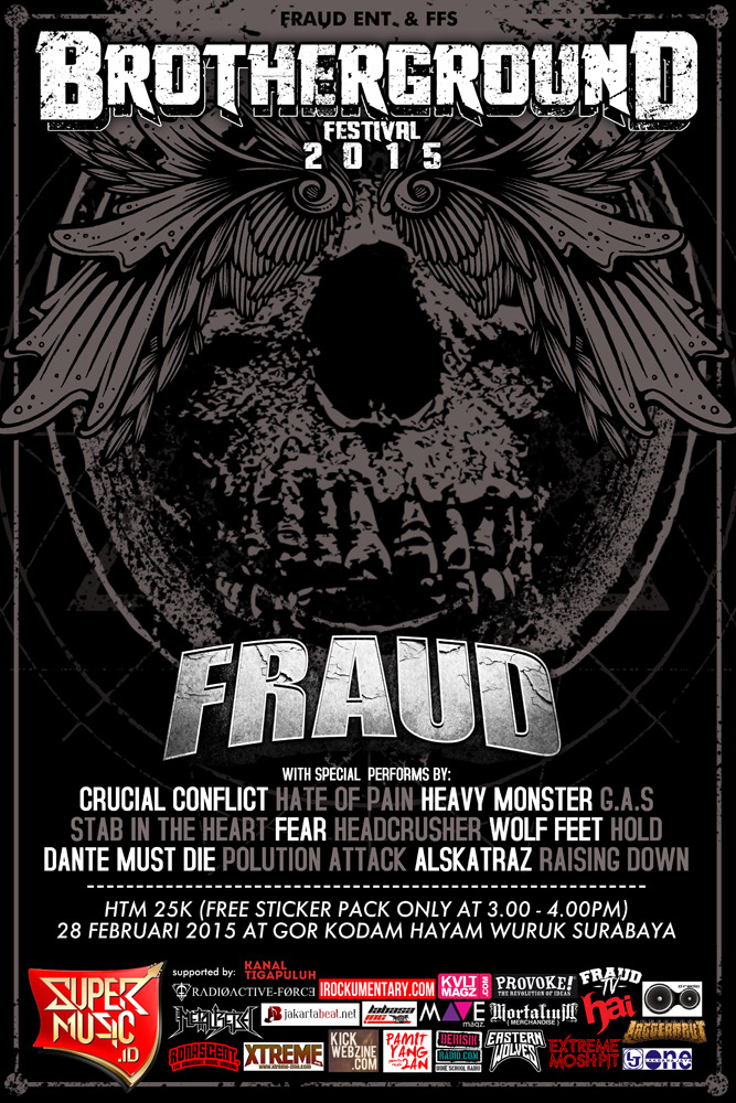 Awal tahun 2015 kota Surabaya kembali memanas dengan hadirnya salah satu event sadis sebut saja BROTHERGROUND FESTIVAL 2015. line up band-band berdistorsi dari generasi old skool to the new skool akan ada semua dalam event yang rencananya memang diadakan pada 28 Februari 2015. event ini bisa dikatakan partynya 4th anniversary sekaligus pra-launching album kedua dari FRAUD yang rencana album tersebut akan dirilis pertengahan tahun 2015. ada 14 band berbahaya full dari Surabaya semua akan menjadi spesial opening.
