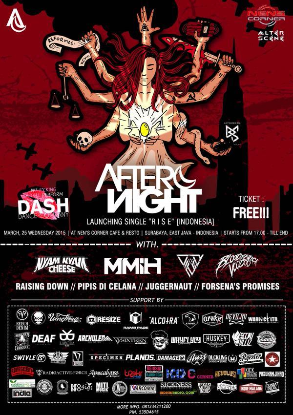 dominasi di skena musick Surabaya circa 2012 sampai sekarang dengan gempuran band-band hardcore tidak membuat band yang berdiri tahun 2009 ini hilang begitu saja. yeah, mereka adalah AFTERNIGHT unit post hardcore yang masih eksis sampai sekarang hadir lagi dengan single terbarunya “RISE (Indonesia)”. musik yang lebih fresh dan gresss, dari segi kualitas sound juga sangat di perhatikan alhasil maksimal euy. konsep musik mereka juga lebih “ngeh” banget dari konsep mereka sebelumnya..yah inilah yang saya harapkan buat band-band Surabaya lebih ke depan lebih berprogres dengan baik, salute brow!. btw, single terbaru mereka ini juga akan dibuat launching dalam suatu gigs tanggal 25 maret di Nens Corner Surabaya bersama opening band-band Surabaya lainnya. sukses untuk ke depannya brow, Segan!.