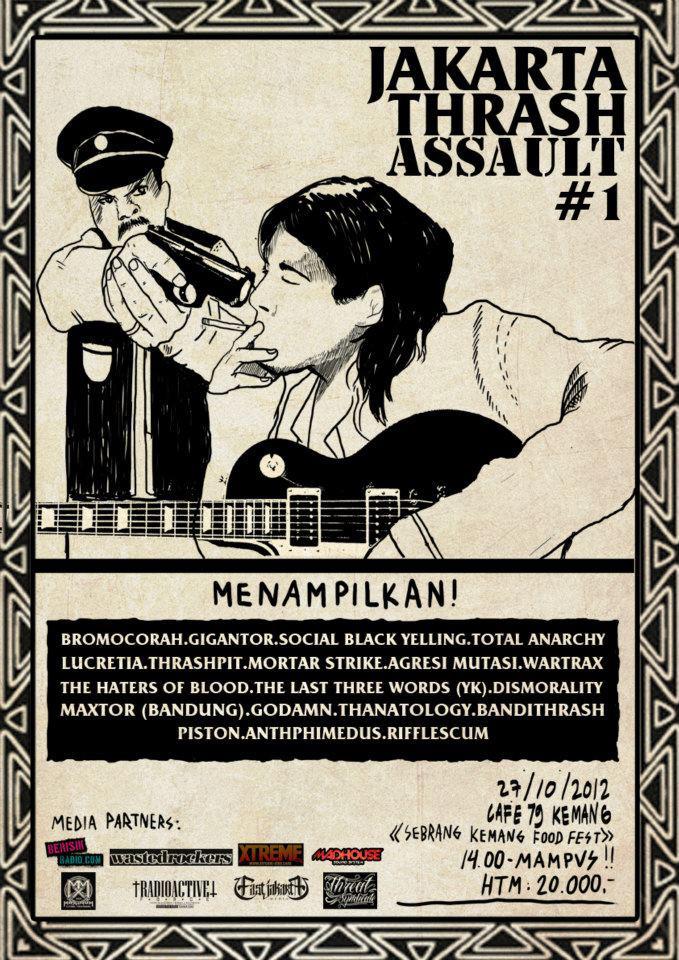 JAKARTA THRASH ASSAULT #1 sebuah dedikasi untuk mengibarkan bendera thrash metal di bumi pertiwi ini. acara ini siap menghajar kalian sampai mampus pada tanggal 27 oktober 2012 di Cafe 79 Kemang Jakarta (sebrang kemang food fest) dengan memuntahkan 19 pasukan liar, ganas dan beringas. htm cuma Rp 20.000 saja kalian bisa enjoy bersama di mosh-pit area, headbanging non-stop, slam or stage dive…sukses dan segan ! thrashin all around!!!!