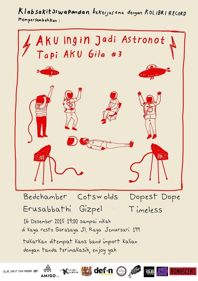 Klab Sakit Jiwa Pandan kali ini bekerjasama bersama Kolibri Rekords membuat gigs pada 16 Desember melanjutkan chapter gila-nya Aku Ingin Jadi Astronot Tapi Aku Gila #3. Itu baru kalian mengenal nama gigsnya saja, jadi diharapkan kalian seru-seruan bareng bersama 6 band lokal yang terpilih untuk mengisi chapter ketiga yang semakin gila ini. Dari kawan-kawan Surabaya ada Cotswolds, Dopest Dope, Timeless, Erusabbathi kemudian dari Jakarta ada Bedchamber dan Gizpel yang sedang dalam tour promo album. Yang belum tau venue gigs ini kalian bisa search Jl. Raya Jemursari 144 Surabaya disitu kalian bisa menemukan Kaya Resto. Merchandise dari masing-masing band yang tampil akan ada juga pada saat gigs berlangsung, jadi jangan sungkan untuk bawa doku lebih.