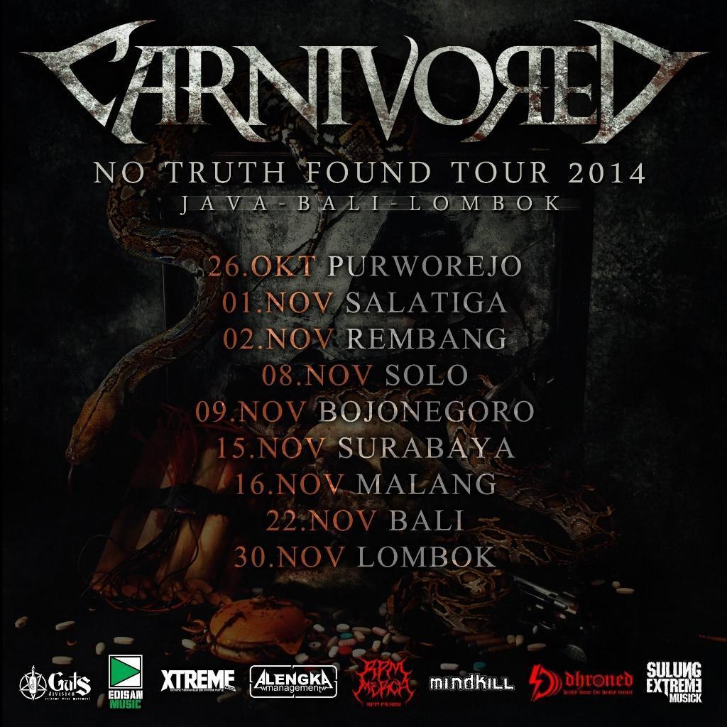 Setelah melesatkan album keduanya bertitle No Truth Found di awal tahun 2014, para kuartet death metal asal Tangerang ini mengadakan promo tour albumnya di Jawa, Bali dan Lombok. title tour mereka yakni No Truth Found Tour 2014 akan start pada 26 oktober di kota Purworejo dan selesai pada tanggal 30 november di Lombok. mereka juga akan meracuni metalhead Surabaya tepat di tanggal 15 november dalam event Horrible Fest #5. selamat beribadah dan menebar racun di tiap kota yang ada dalam jadwal tournya brow, Segan !.