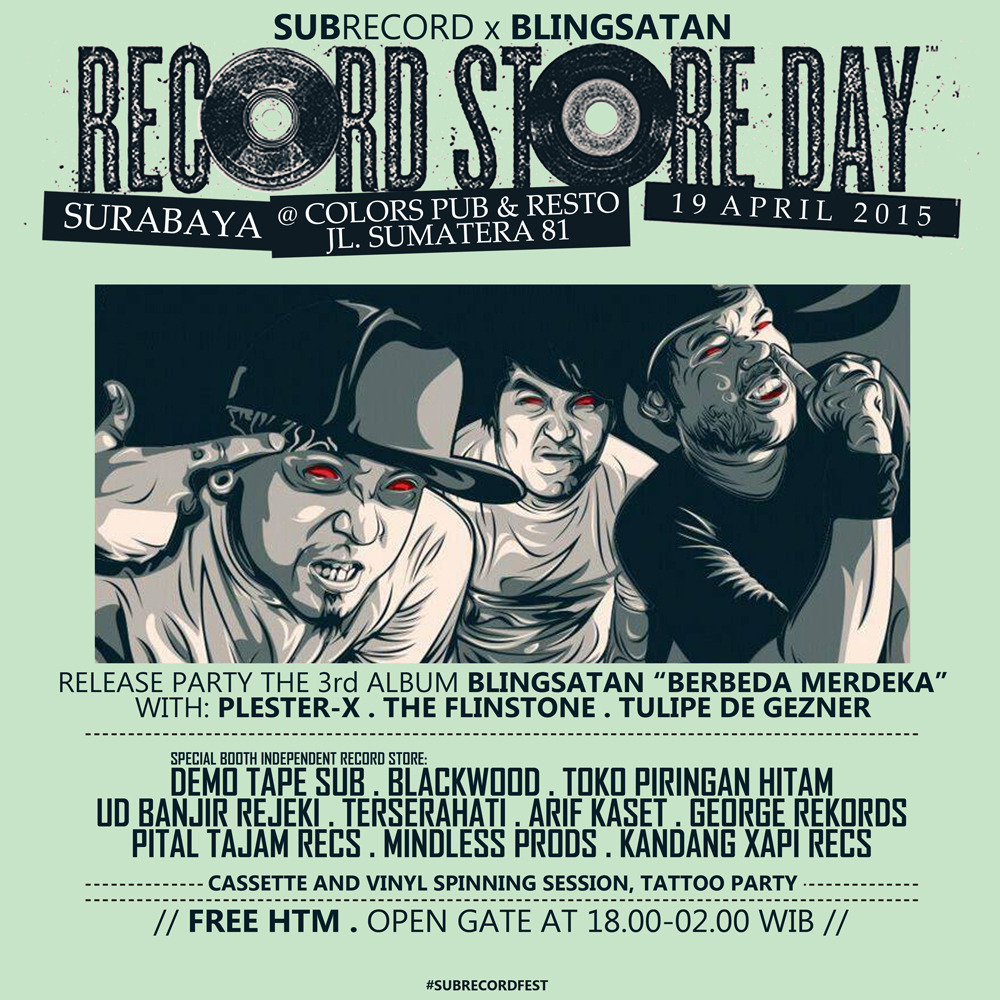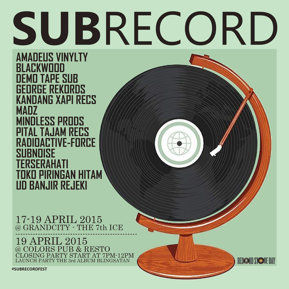SUB RECORD kembali beragenda menjelang Record Store Day 2015 dengan tiga hari para lapakers akan berkumpul dan bertransaksi jahat. disini kalian harus baik untuk menyimak karena ada dua tempat yang akan disinggahi para lapakers rilisan fisik ini. tanggal 17 sampai 19 april ada di Grandcity dalam event The 7th IndieClothingExpo kemudian tanggal 19 april malam lebih tepat start jam 7 juga singgah di Colors Pub & Resto dalam event launch party album ketiga dari band street rock Blingsatan. wajib bagi kalian untuk membawa duit ekstra biar belanja berhalanya juga makin afdol hahaaa..mari membudayakan rilisan fisik, download is good but PHYSICAL RELEASE ARE REAL.