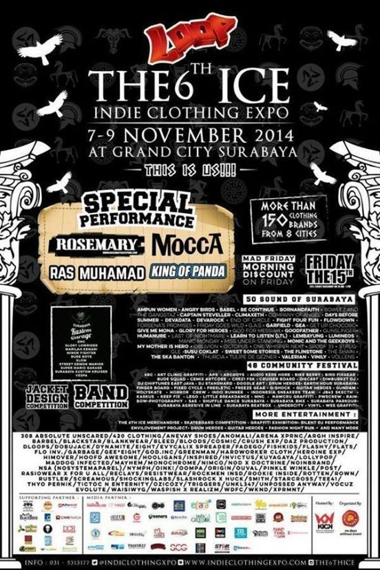 Sudah memasuki tahun ke-6 untuk event Indie Clothing Expo Surabaya dan tahun ini juga tahun ke-2 venue bertempat di Grandcity Mall setelah tahun pertama sampai keempat di Gramedia Expo. semakin tahun talent dari brand lokal-komunitas-band makin banyak yang join, konsep dari event ini juga makin bagus di dukung dengan venue yang lebih besar. di tahun ini event akan diadakan pada tanggal 7-9 november dengan guest band lokal seperti Mocca, Ras Muhamad, Rosemary, Devadata, My Mother Is Hero, G.A.S, Valerian, King of Panda, Humanure, Climaxeth, The FlinsTone, Give Me Mona, The Ska Banton, Vinily dan masih banyak lainnya. untuk brand lokal yang pasti dari teman-teman KICK seperti Unkle 347, Arena Xprnc, Flashy, Oink!, Ouval Rsch, Rockmen Inside, Noinbrand, Cosmic, D’Loops, Rown Dvsn, GOD INC, Inspired, Slackers dan brand lokal keren lainnya. ramaikan dan sukseskan event ini brow/sis..support you local movement.
